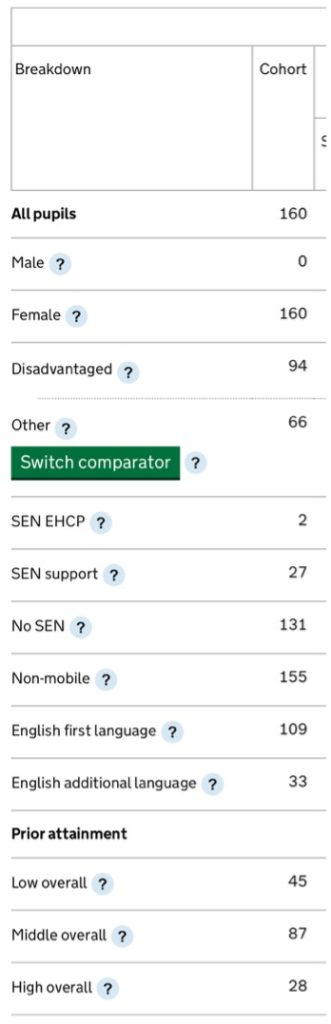 As far as the school is concerned, this is a helpful starting point. They would want to know how well their boys and girls had performed, what their pupils with SEN had achieved and so on, when comparing them to the national data contained in ASP. You can even click that green button to compare the performance of disadvantaged pupils with their disadvantaged peers, which is a more accurate, if troubling, comparison than the DfE default setting.