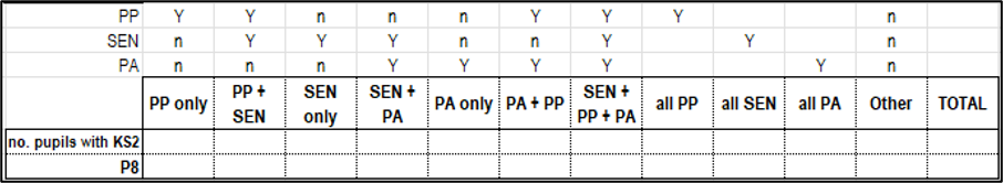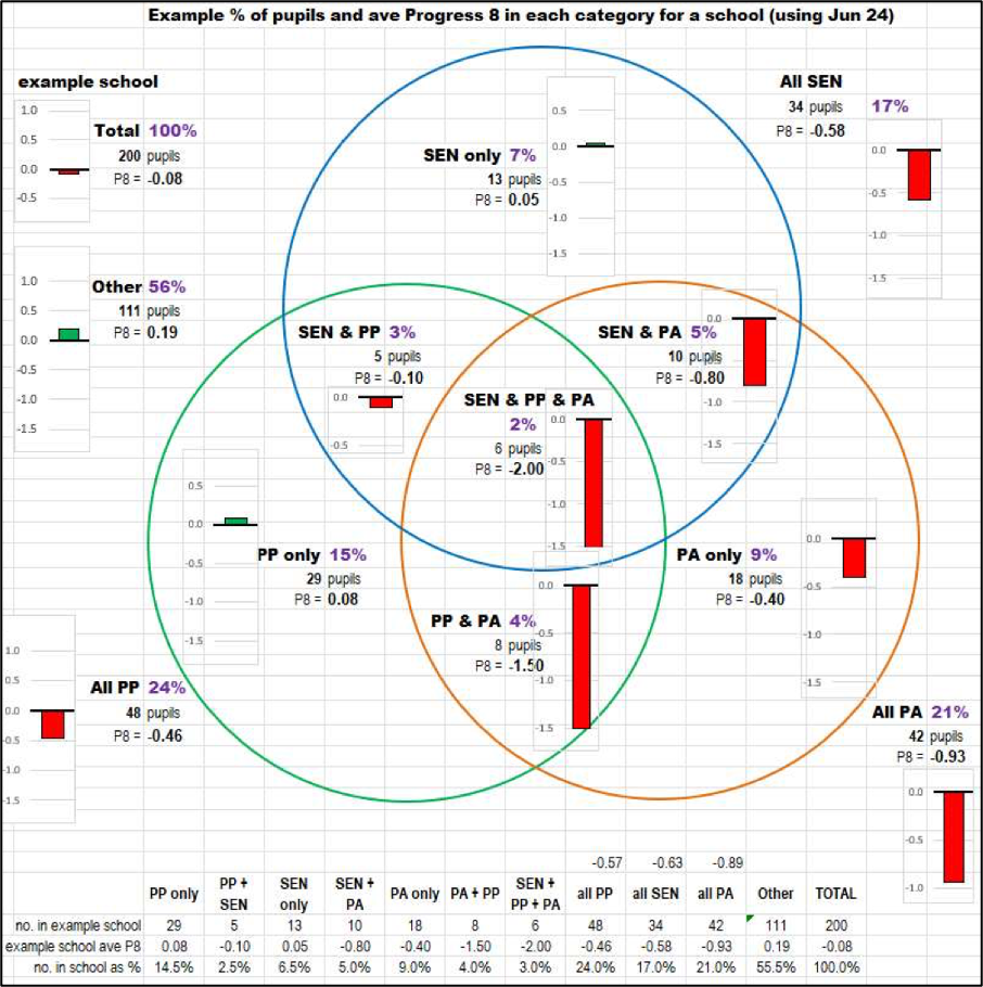 In a recent webinar, David Blow, the Executive Head of SESSET multi-academy trust shared an intersectional analysis of pupils from a typical secondary school. He investigated the connection between SEN, pupil premium and persistent absence and looked at the Progress 8 scores of pupils who had any combination of those characteristics.